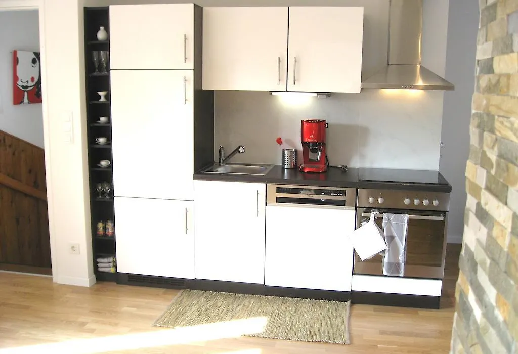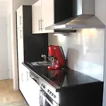The apartment comes with coffee/tea making machines and a kitchen featuring a fridge, an oven, and kitchenware.
